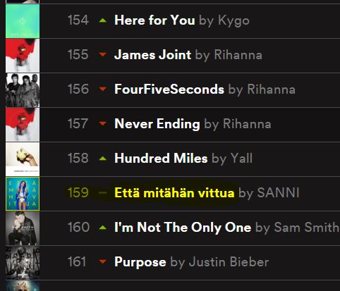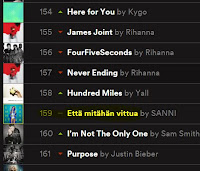 Santa Cruz, Yö tai Juha Tapio ei biiseillään listasijaa saanut ja Chisukin sai viikon verran odotella, että Tähdet teki re-entryn sijalle 150.
